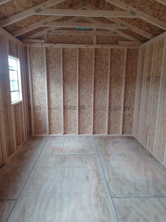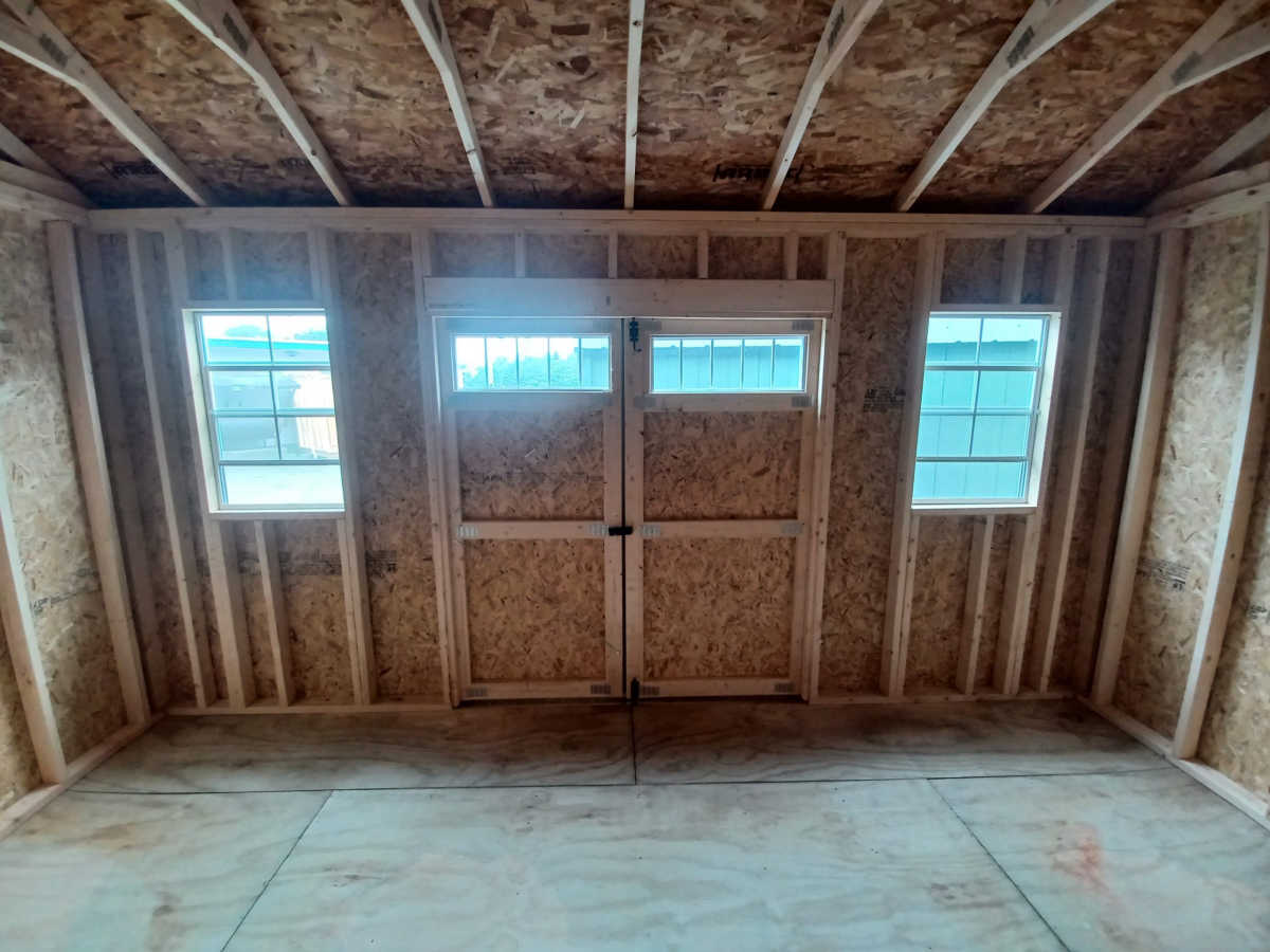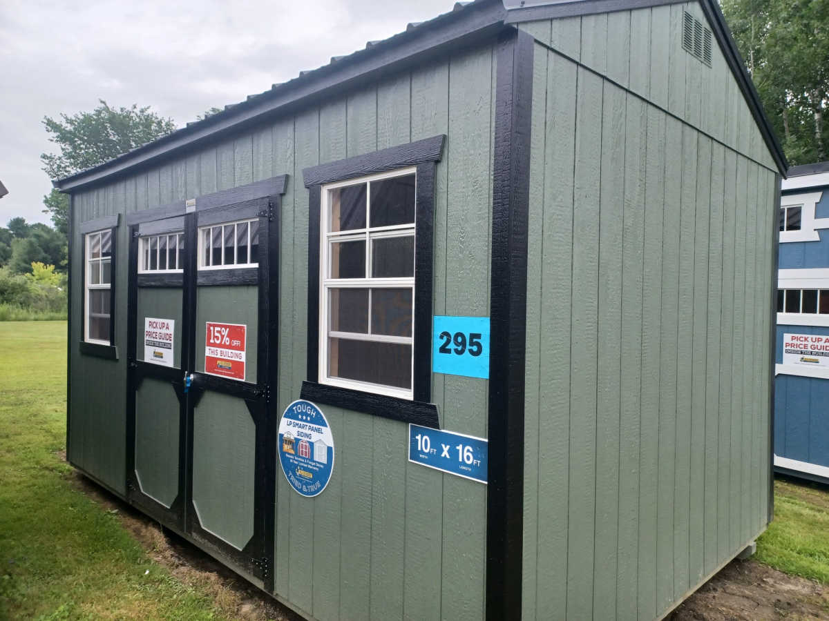 New 10x16 utility shed with metal roof, 8' walls, smart panel exterior, double doors with windows, 2 2'x3' windows, 5/8 treated square edge flooring, and diamond plate threshold.